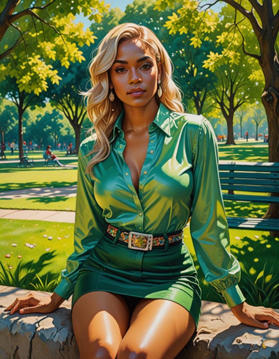 This vibrant oil painting captures a Dominican woman in her twenties sitting in a sun-dappled park. She is depicted with toned legs, wearing a micro-mini skirt and revealing blouse, in a style emphasizing triadic colors and rich detail.