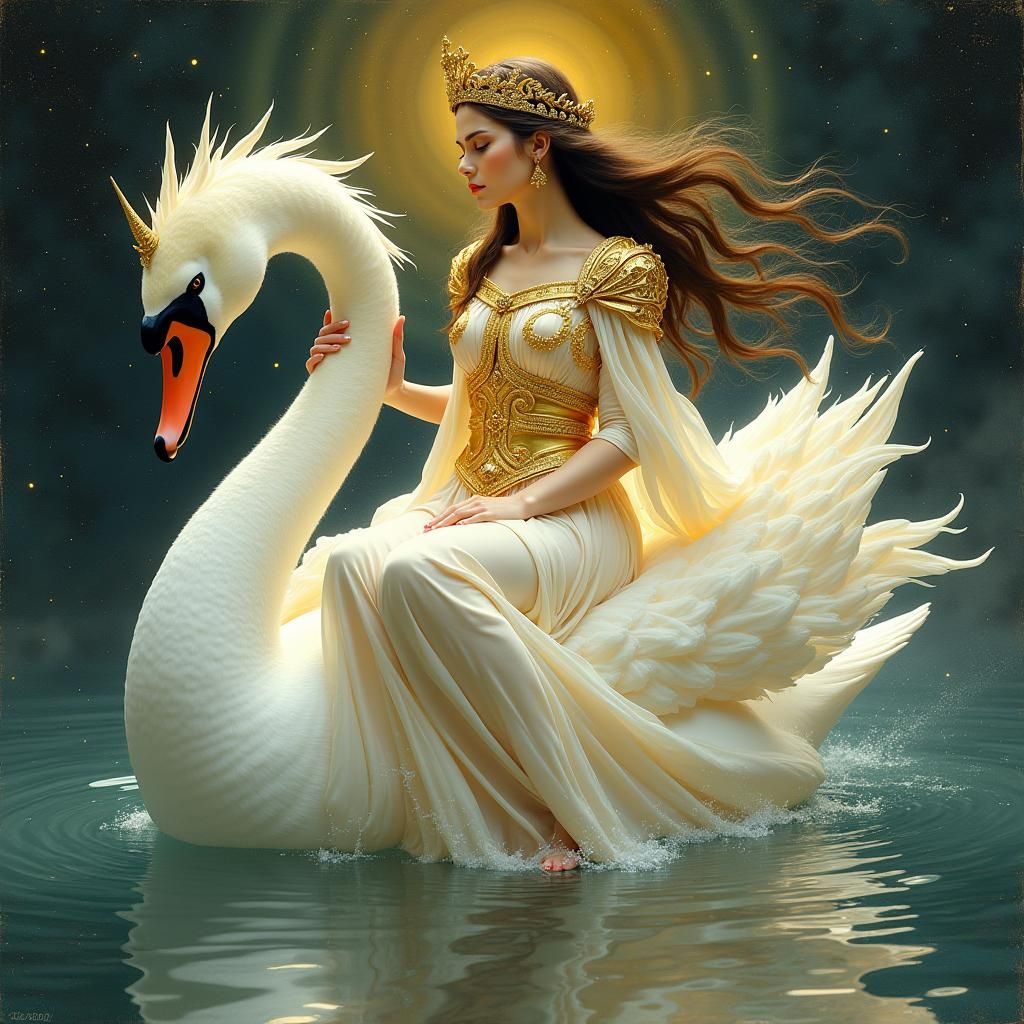 A striking picture of a goddess in golden armor on a white swan. The artwork evokes a symbolist style with art nouveau details, illuminated by moonlight and stardust, creating an ethereal and otherworldly scene.