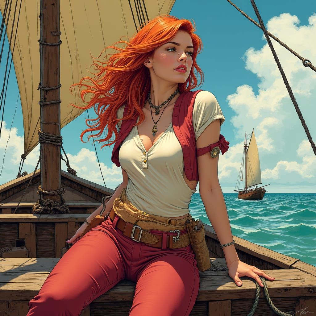 A stunning image of a blonde explorer in a vibrant red and white tunic, tied to a ship's mast with a rope, in a perfect comic book aesthetic with smooth lines and bold colors, inspired by the works of Ian McQue and Simon Stalenhag.
