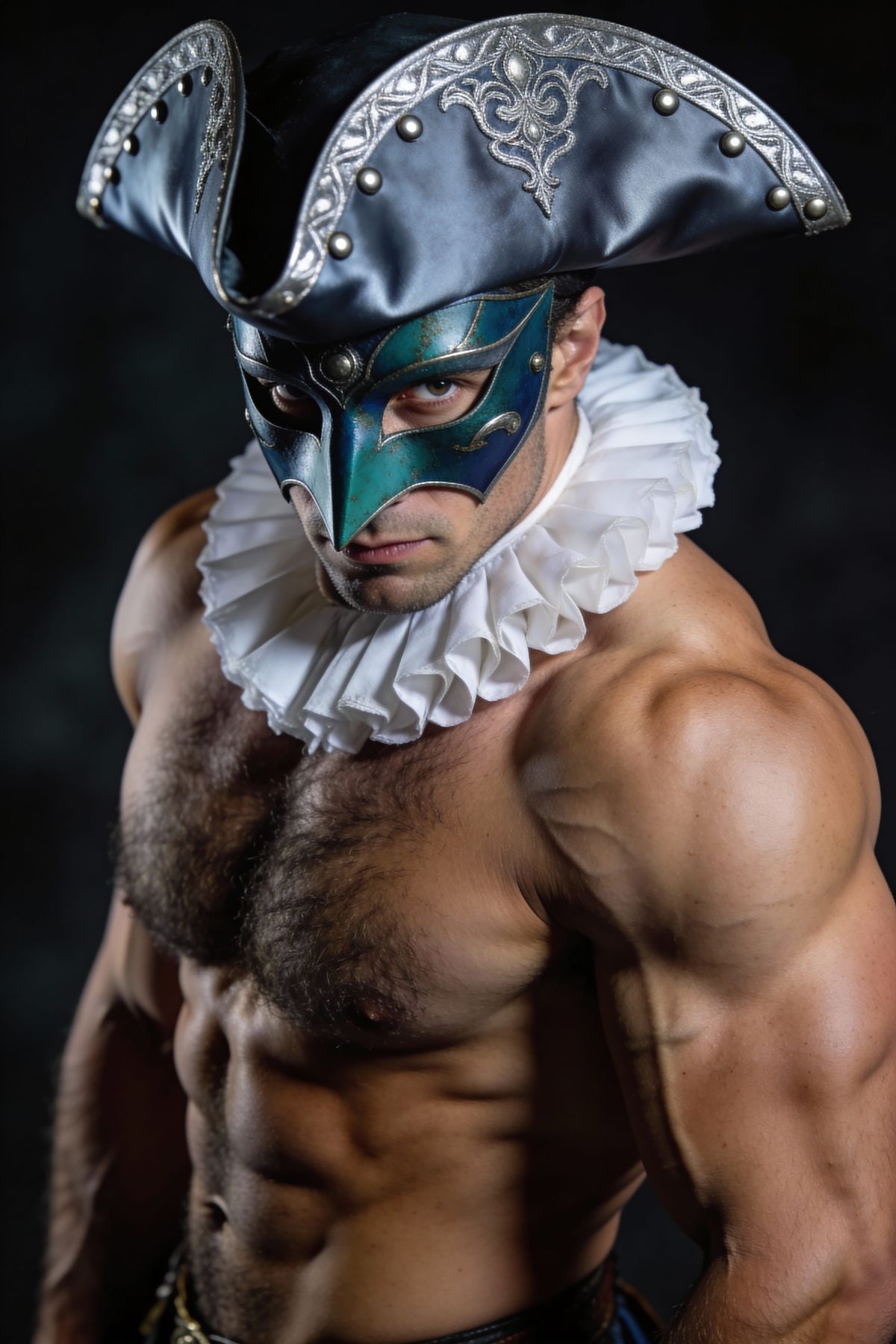 This image features a striking, ultra-realistic portrait of a muscular man inspired by dark Renaissance nobility. Captured with cinematic lighting, he wears a ruff collar and a Venetian mask.
