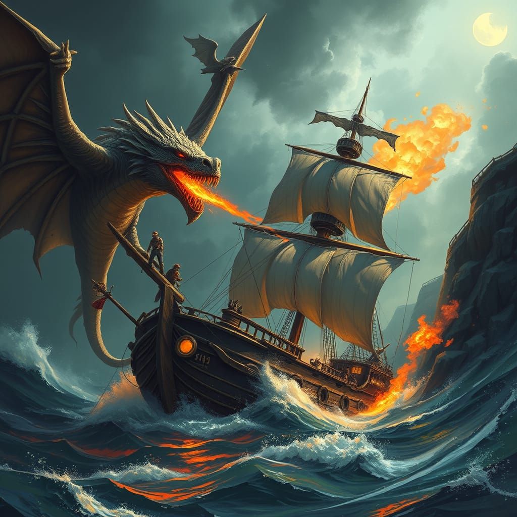 A dramatic image of a dragon attacking a pirate ship in stormy seas. The artwork evokes a gritty, industrial feel blended with dynamic, atmospheric landscapes and intricate fantasy details.