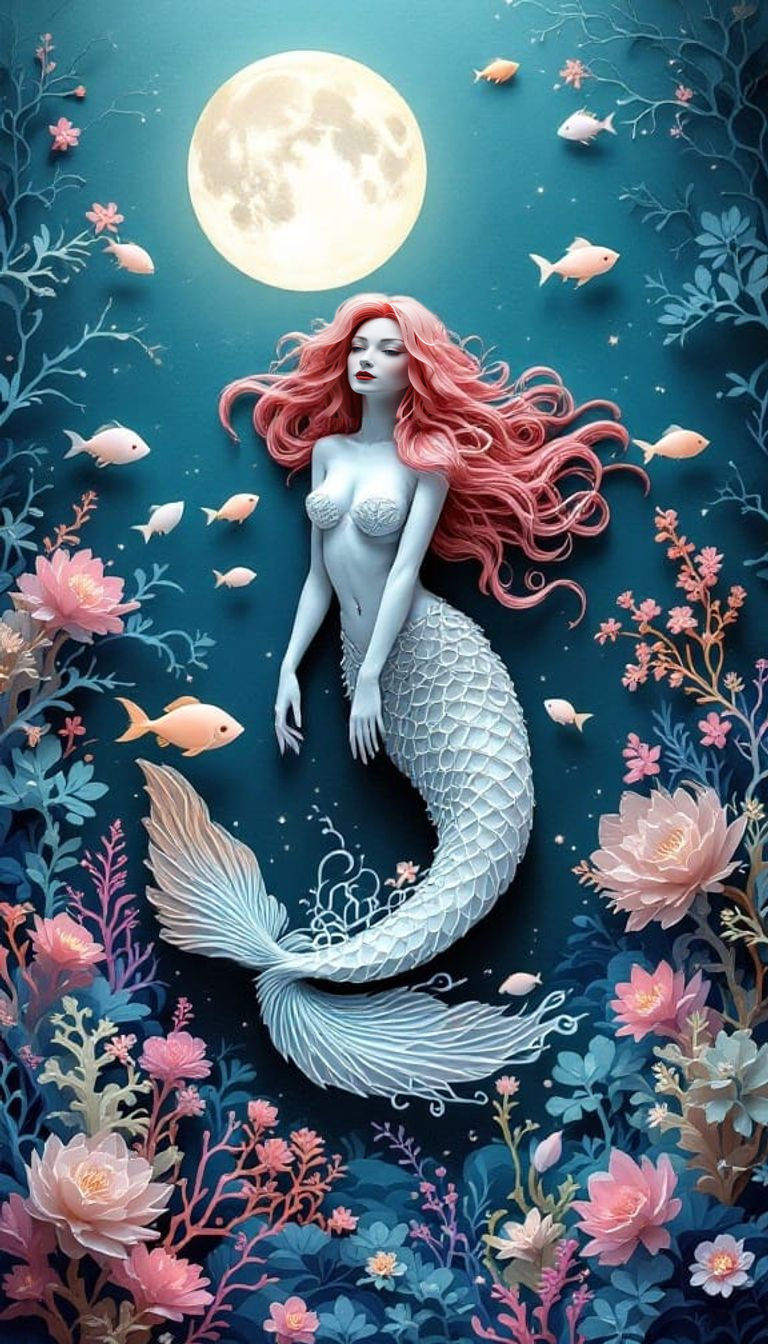 A striking picture of a mermaid drifting in a tranquil underwater realm. The mermaid has flowing pink hair and a sculpted tail, surrounded by pastel fish and coral in a dimensional papercraft style.