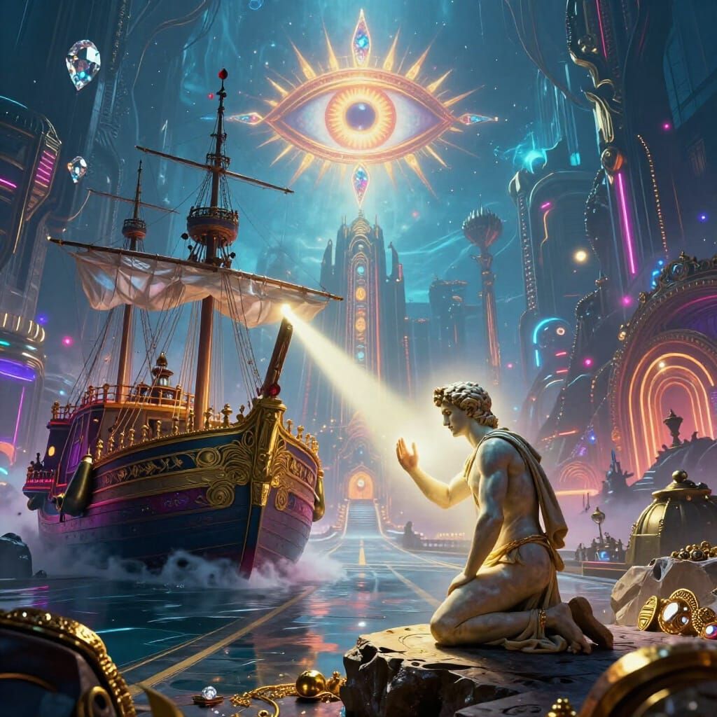 epic antique scene : Armenian sirens on a ship at middleground, calling michelangelo guy , at foreground on a small rock. very connected spiritual, in the epic road of city of shamballah in background with third eye, ray of light between characters gold and diamonds elements