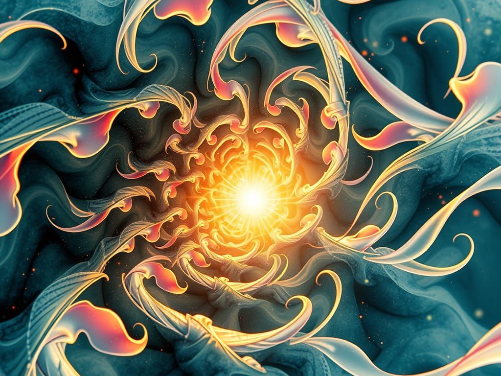 This image shows an AI-generated artwork blending Ukiyo-e and surrealist elements. The composition features a spiraling golden ratio, enhanced by lens flare and watercolor effects in solarpunk style.