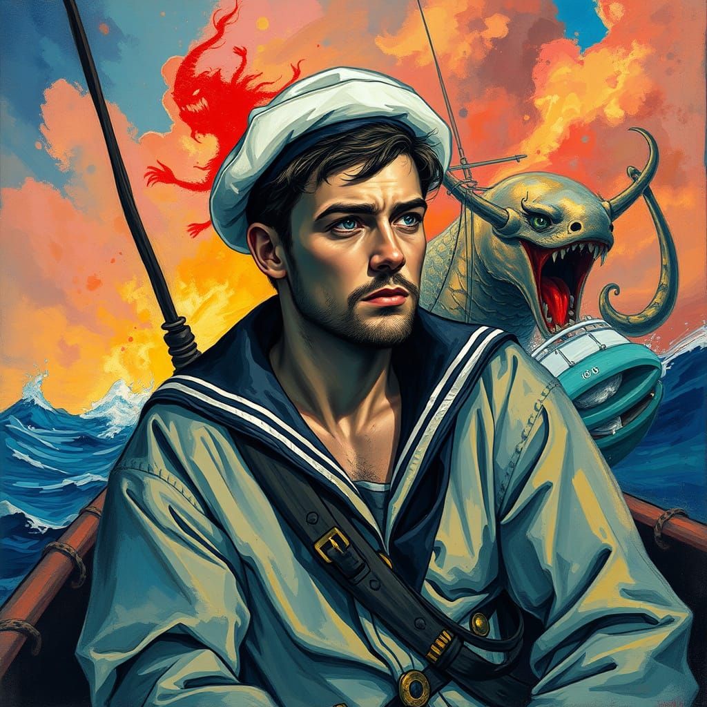 A captivating image of a sailor on a boat, surrounded by a mystical siren emerging from the sea, created in a vibrant Gouache style with expressive Watercolor brushstrokes, reminiscent of an Impressionist masterpiece.