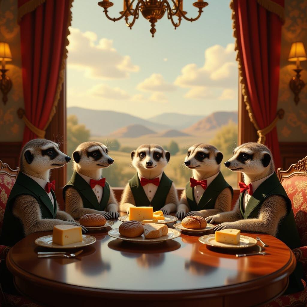 A gathering of meerkats dressed in vintage clothing, enjoying a meal. The image features rich details and warm lighting, with a blend of whimsy and hyperrealism, as 3D rendered digital art.