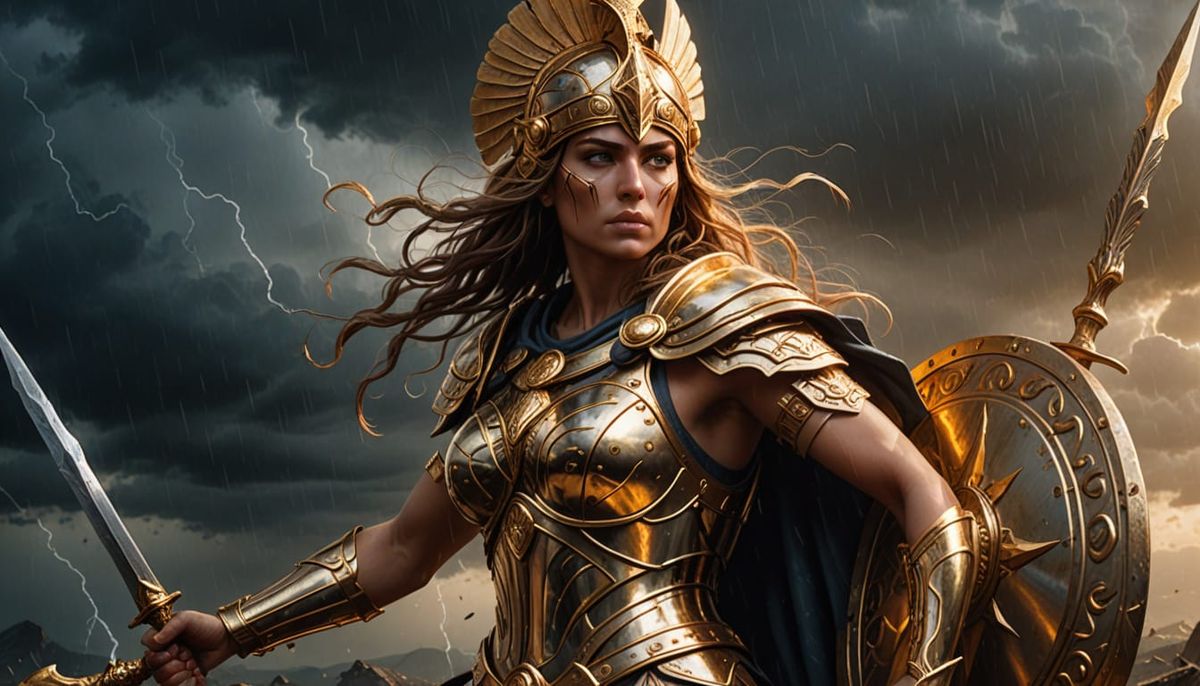 This image shows Athena, a powerful female warrior, in a heroic pose amidst a stormy battlefield. She holds a spear and shield, surrounded by a glowing aura, depicted as detailed 3D rendered digital art.
