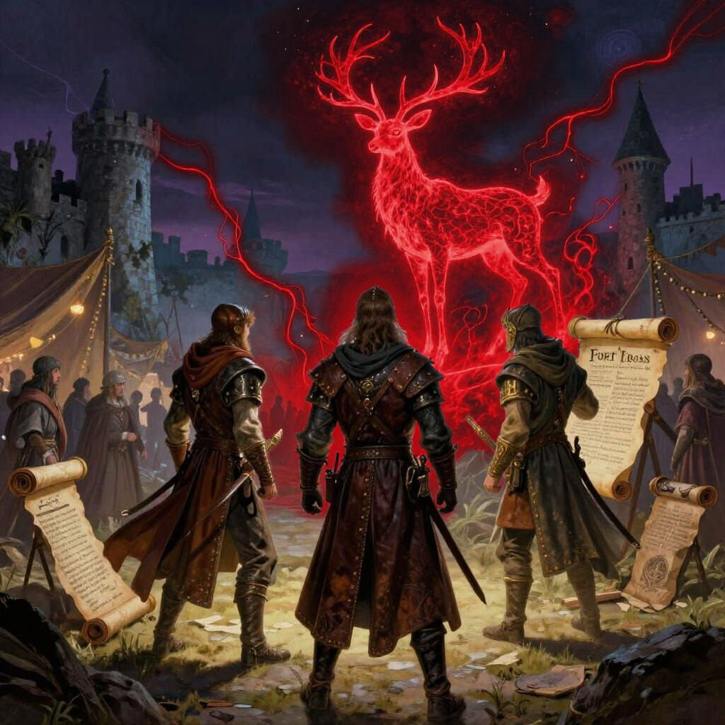 This image depicts a mysterious Nightgarrow, a spirit of a slain talking deer, appearing near the vital trading post of Fort Iroas. The scene evokes a sense of fantasy and intrigue.