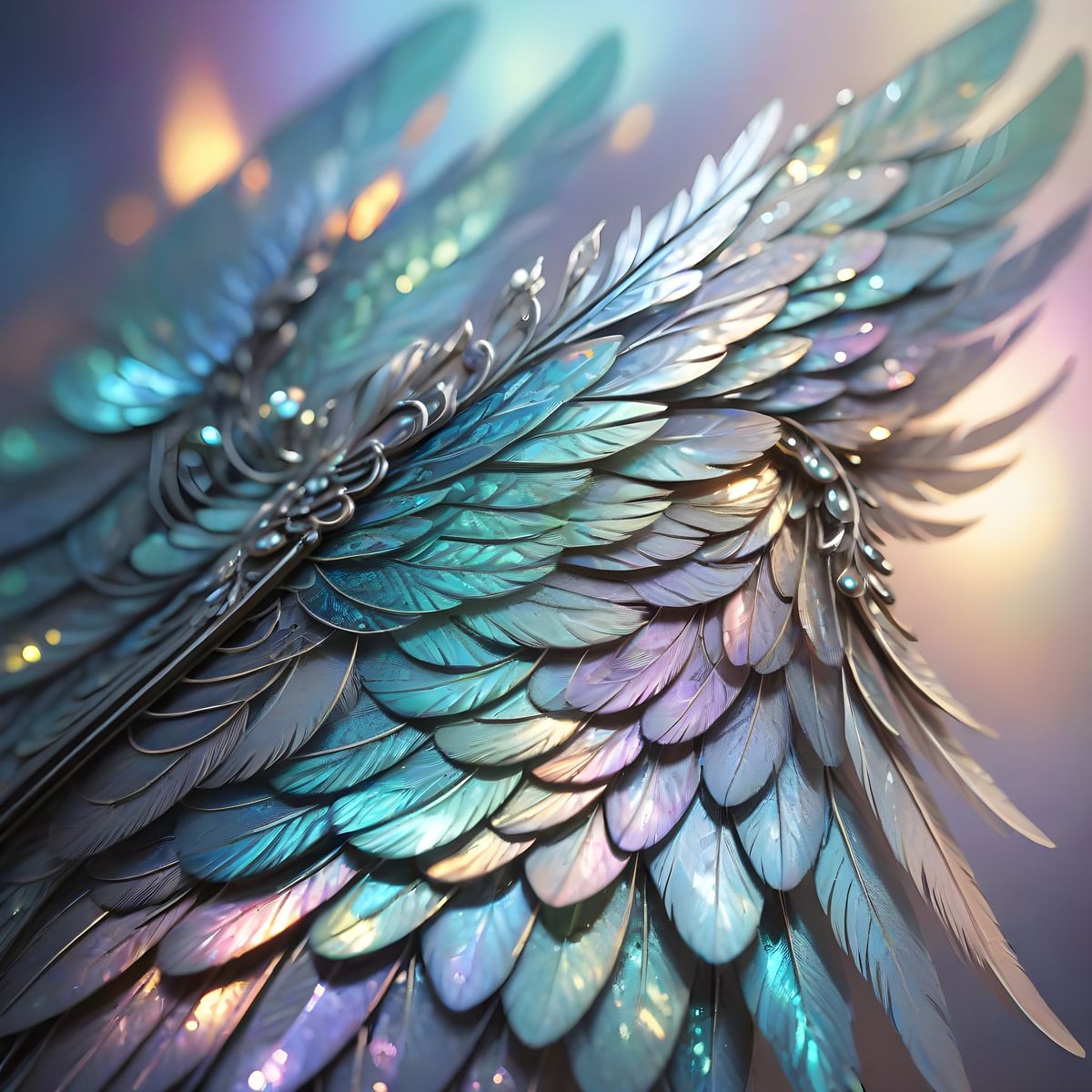 A close-up image of majestic wings with iridescent light. Fantasy art with delicate metallic filigree and flickering flames. The wings have a soft, ethereal glow in pastel colors, like stained glass.