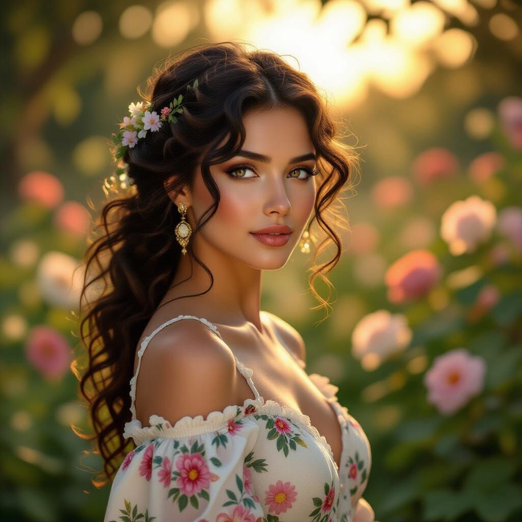 A serene portrait of a woman with curly hair and floral accents, set in a tranquil twilight garden. This Renaissance-inspired image blends classic artistry with modern digital techniques.