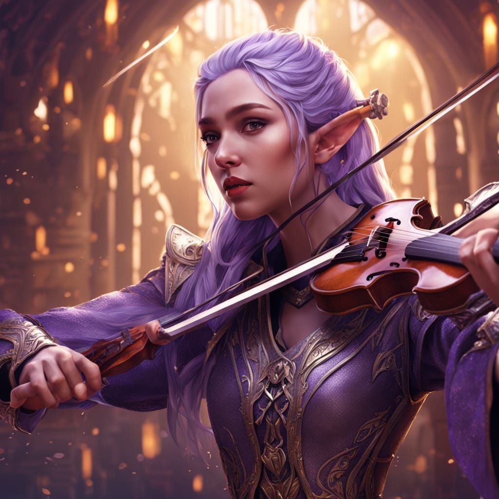 A medium shot of a smiling female high elf in leather armor over light purple robes, playing a silver violin. This detailed matte painting features intricate details, deep colors and warm golden lighting.