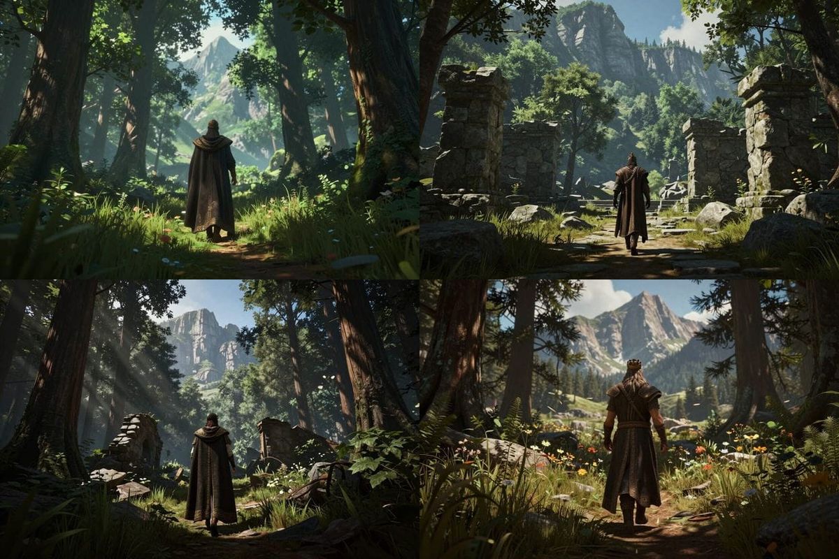 Generate your own images of ancient ruins and kings walking through wild summer woods, easily and for free.