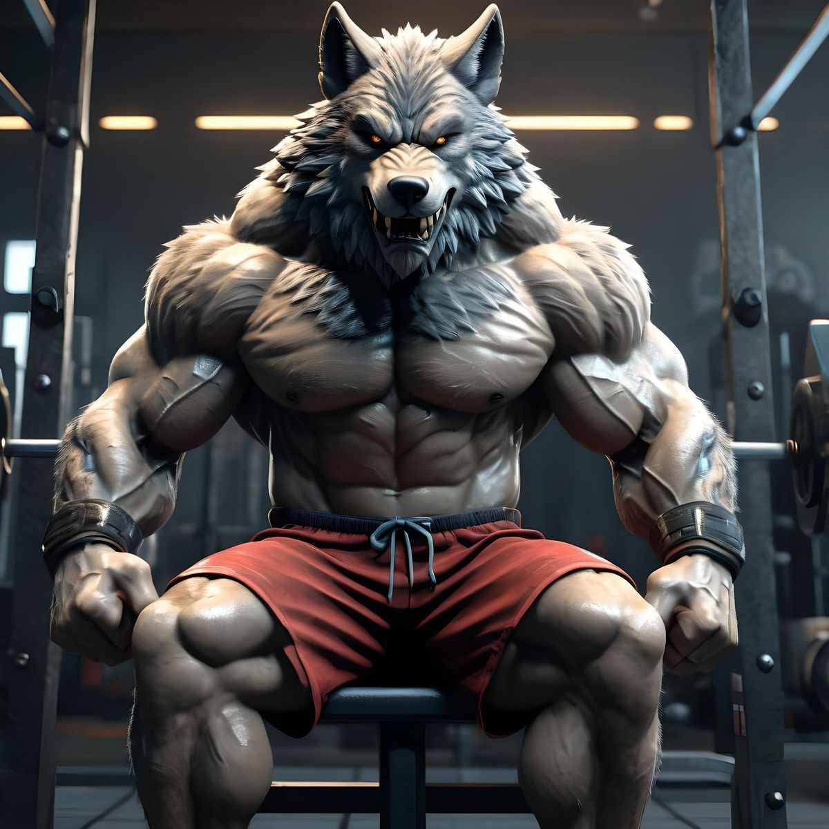 This image shows an anthropomorphic wolf weightlifting in a gym. Rendered with dynamic lighting and intricate details, the artwork has a 3D game cinematic feel.