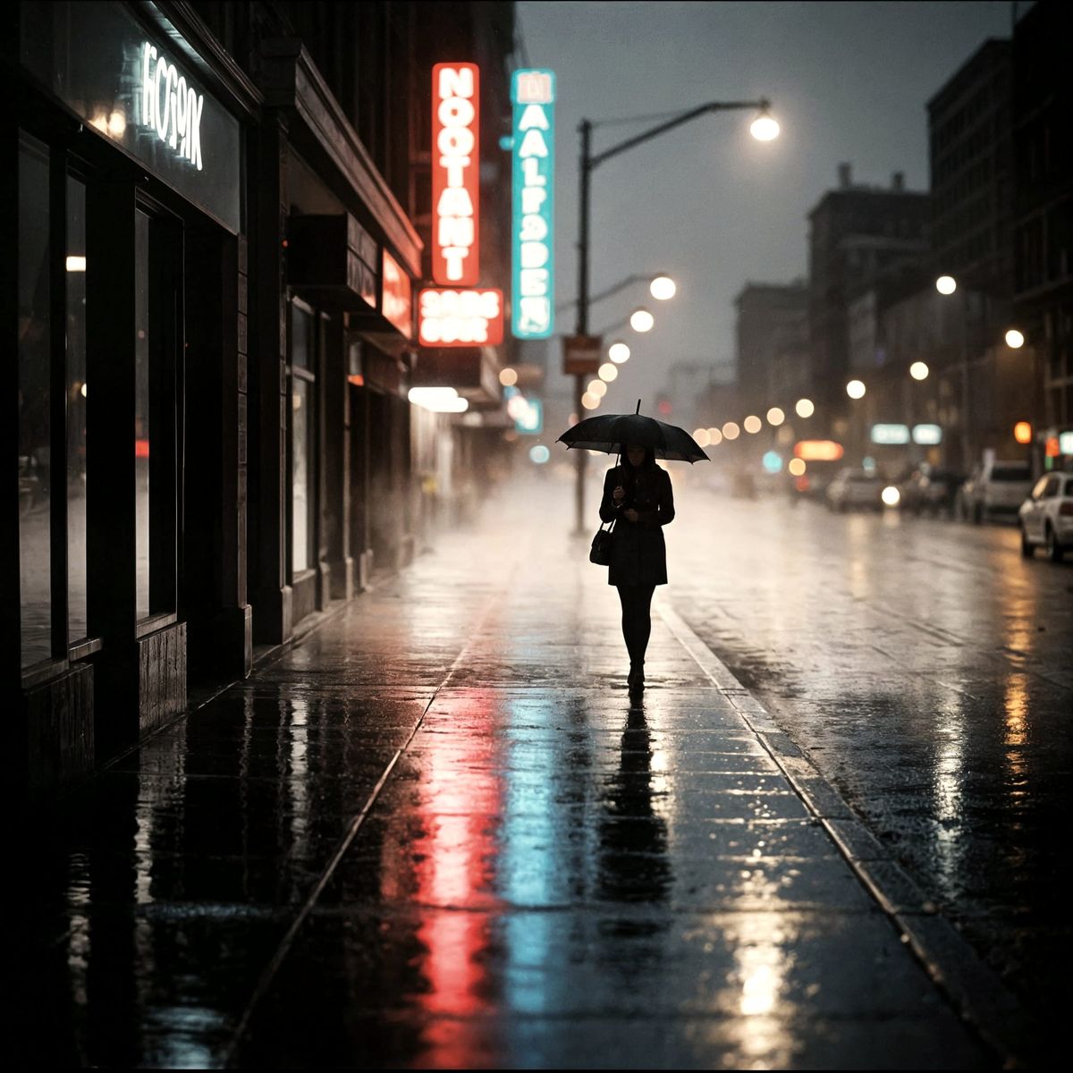 This image shows a solitary woman with an umbrella walking on a rain-slicked city street at night. Soft focus and film grain enhance the nostalgic, moody atmosphere of this vintage realism scene.