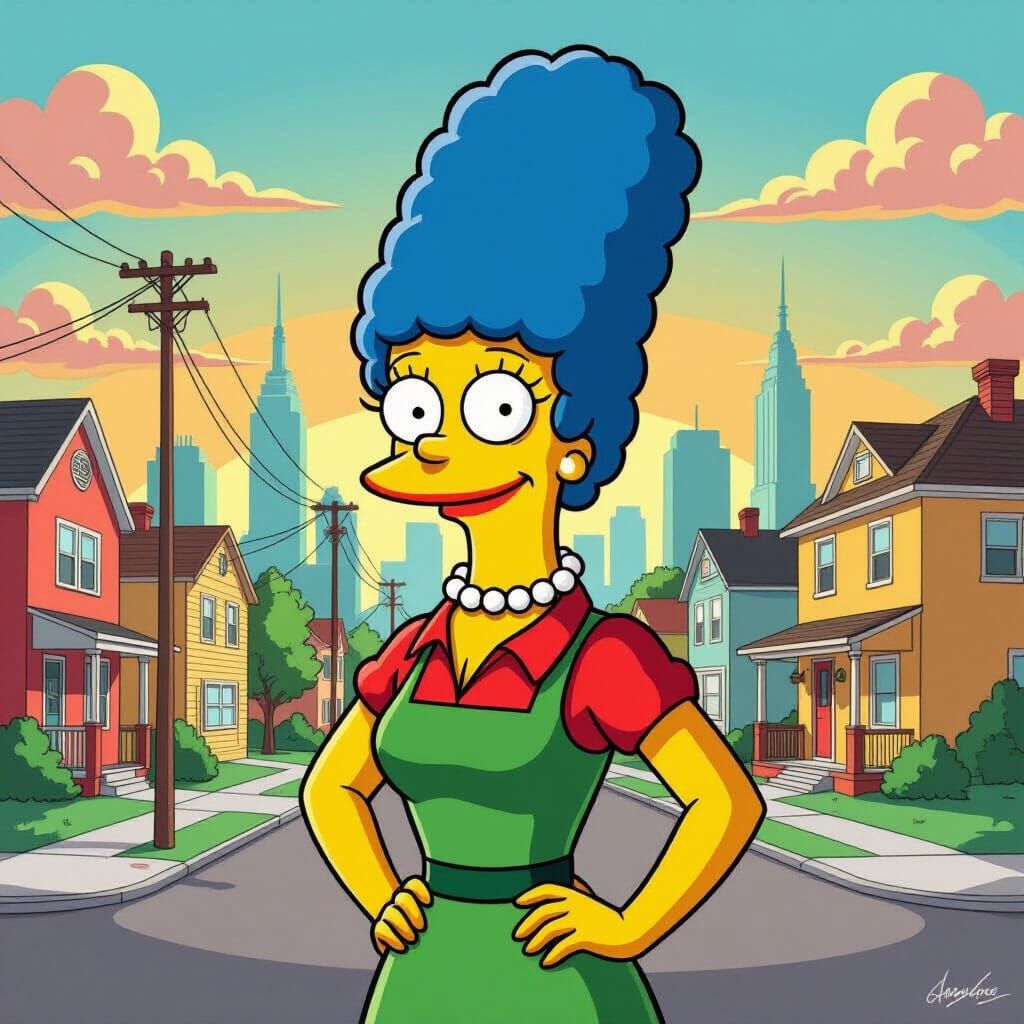 This image features a unique hybrid character combining Lois Griffin and Marge Simpson's iconic looks. Rendered in a vibrant graphic novel style with dramatic lighting.
