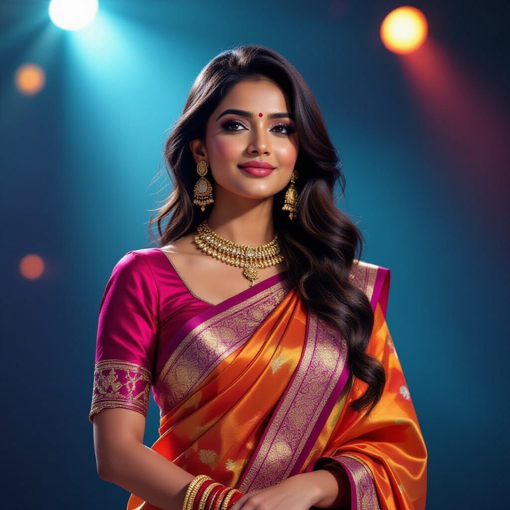 This hyperrealistic image shows a detailed, colorful portrayal of an Indian woman in a sari, dramatically lit on a stage. The splash art style emphasizes intricate detail and depth.