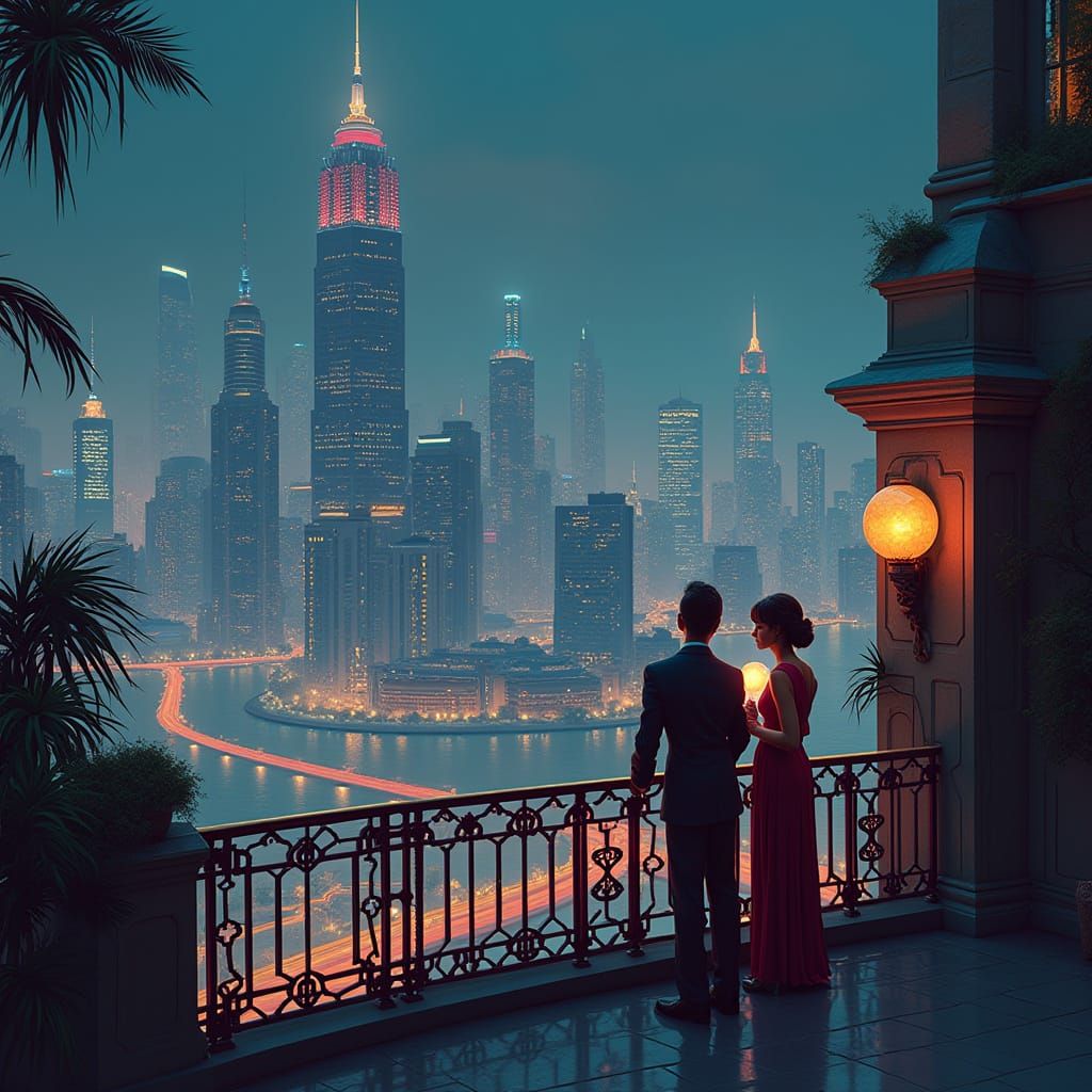 This image shows a couple in 1920s attire on a balcony, gazing at a neon-lit futuristic city. The digital art blends art deco and modern styles in a neo-noir aesthetic.