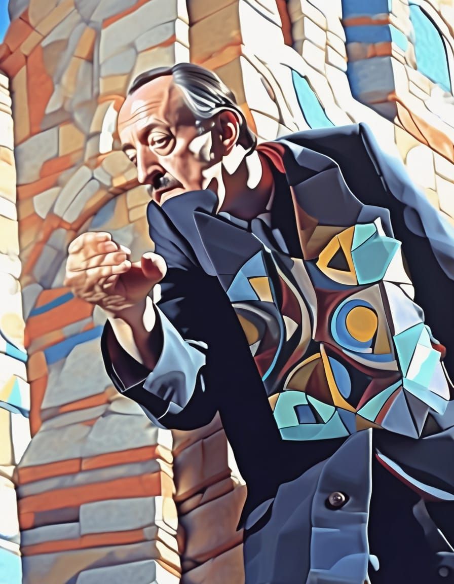 A surreal image in a Byzantine icon style featuring geometric shapes and bold lines. This rendering shows a rejected brick with vivid, split-complementary colors and high contrast lighting.