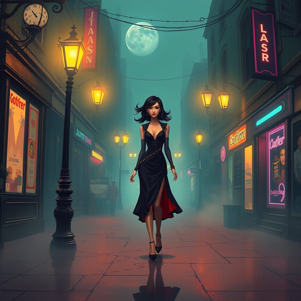 This image shows a woman walking on a misty street illuminated by vintage lamps. The artwork blends a neon noir aesthetic with futuristic and whimsical character design.
