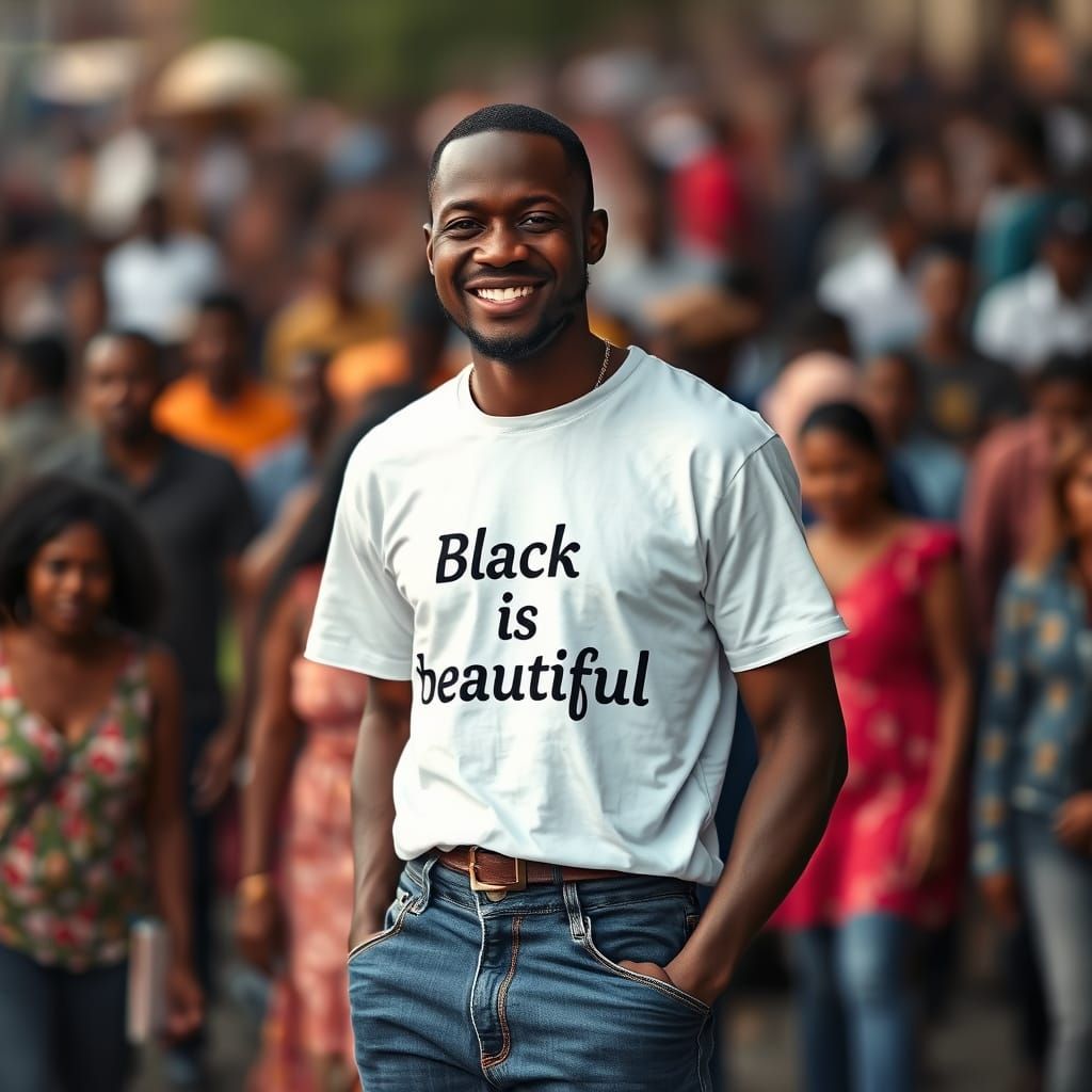 This image is a photorealistic portrait of a handsome dark-skinned man proudly wearing a bold 'Black is beautiful' t-shirt, set against a blurred crowd of diverse individuals, blending the textures and colors of contemporary African art.