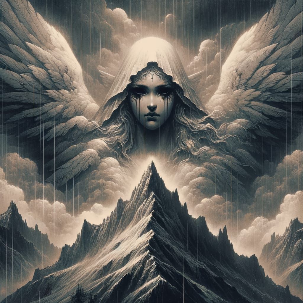 This image shows a dark, ethereal angel figure on a mountain during a storm, detailed with fine lines around the eyes, in a late 20th-century fantasy illustration aesthetic.