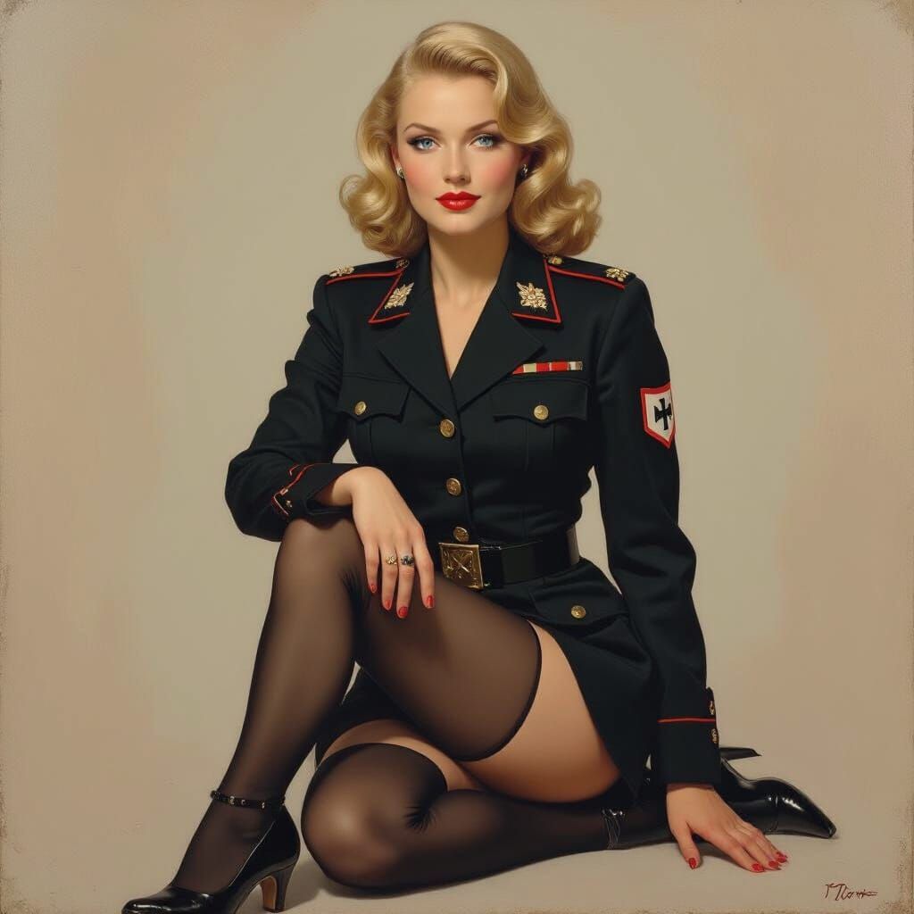 This image depicts a striking full-body portrait of a blonde, blue-eyed female soldier in a 1940s black uniform, high heels, and exposed midriff, rendered as a colored oil painting with dramatic lighting and rich colors.