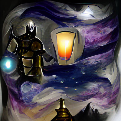 This image shows a Warforged Celestial Warlock holding a lantern at night. The digital illustration features a detailed painting style, highlighting the character's intricate design and the lantern's glow.