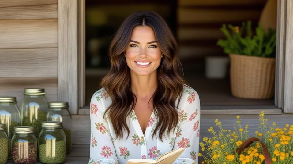 This image shows a young woman with wavy brunette hair sitting on wooden steps. She wears a flowery shirt and jeans in a cozy, earthy scene with soft lighting and muted colors, reminiscent of impressionist paintings.
