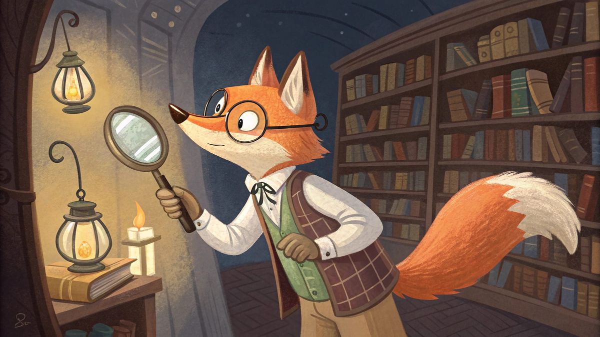 A curious fox detective wearing spectacles and a waistcoat explores a magical library. The scene has a whimsical, fairy-tale aesthetic with elements of wuxia and xianxia.