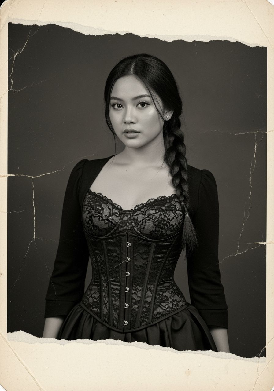 This image shows a torn, sepia-toned vintage photograph from the 1900s. It features a young Indonesian woman in gothic attire seated at a grand colonial dining table, with a grainy, aged texture.