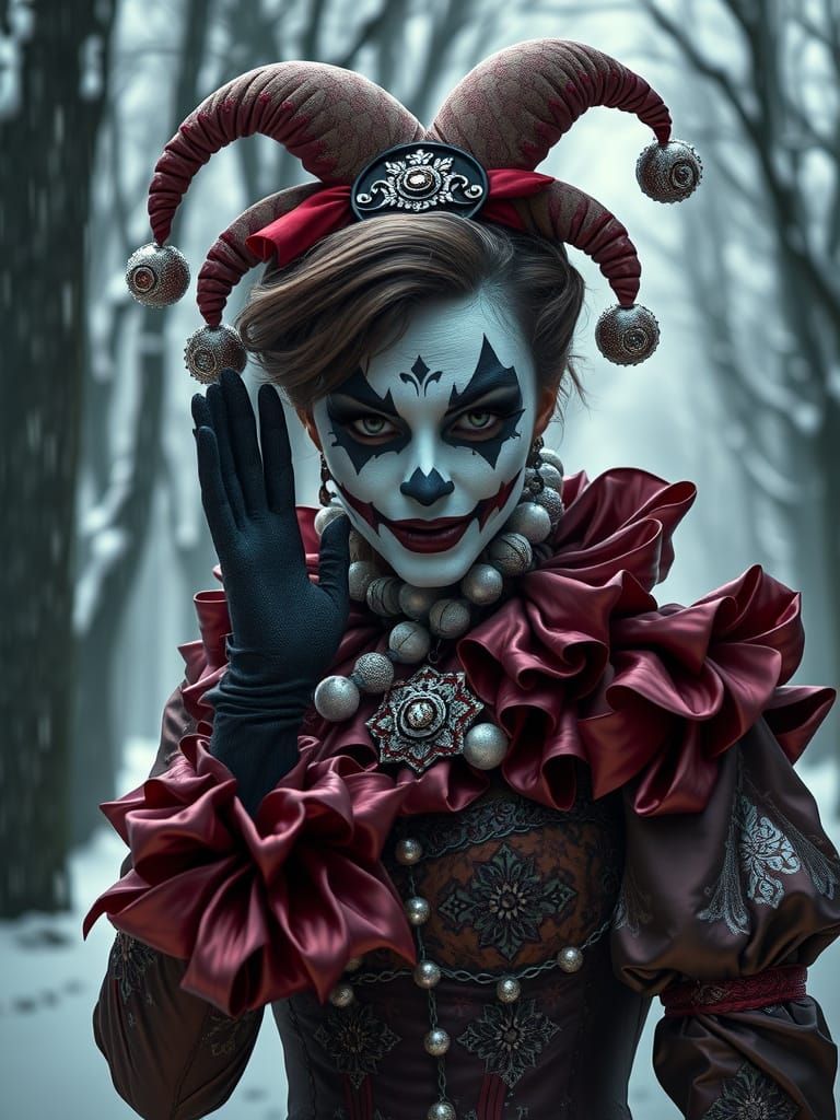 A striking picture of a harlequin in Victorian clothing gesturing for silence. She has a sinister painted smile and stares intensely in a snowy forest. The image is hyperrealistic with cinematic atmosphere.