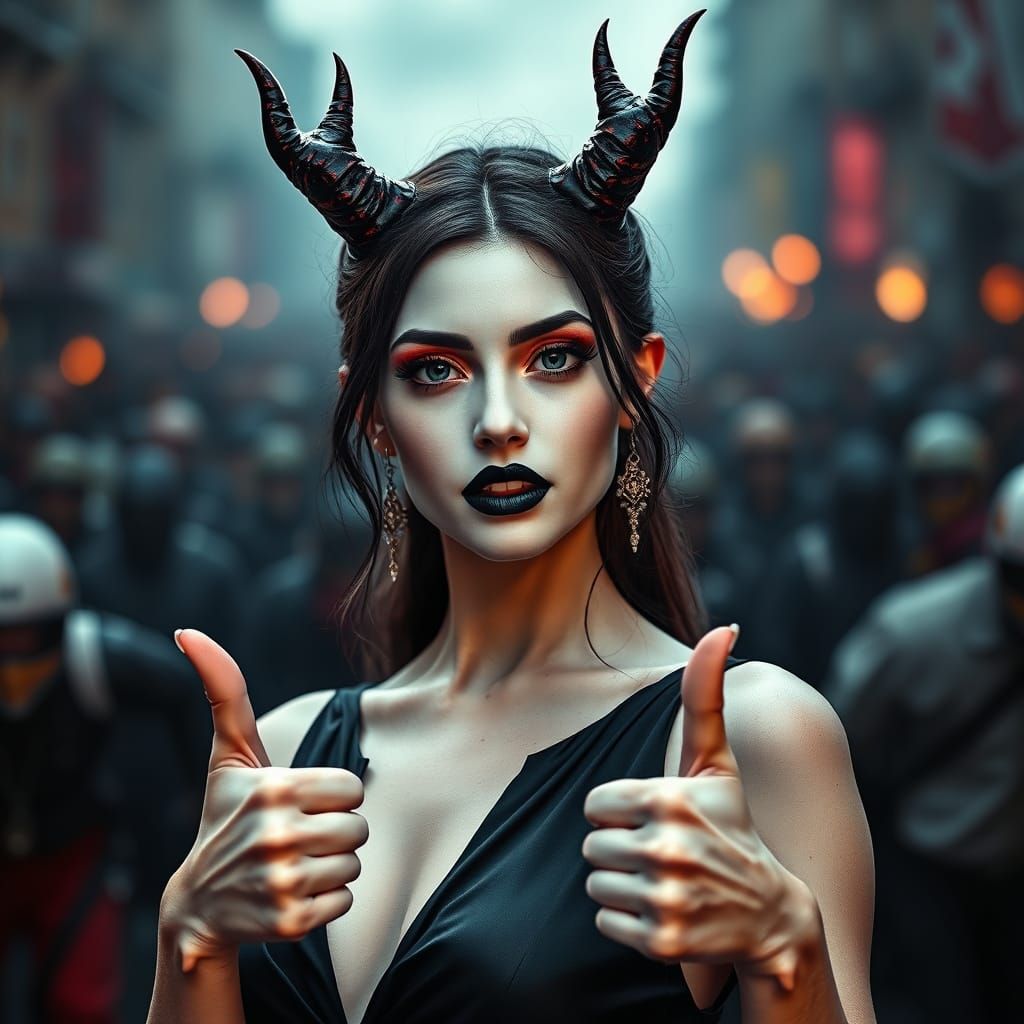 A striking picture of a beautiful woman with devil horns giving two thumbs up. She is wearing an elegant black dress, set against a blurry background in a photorealistic style.
