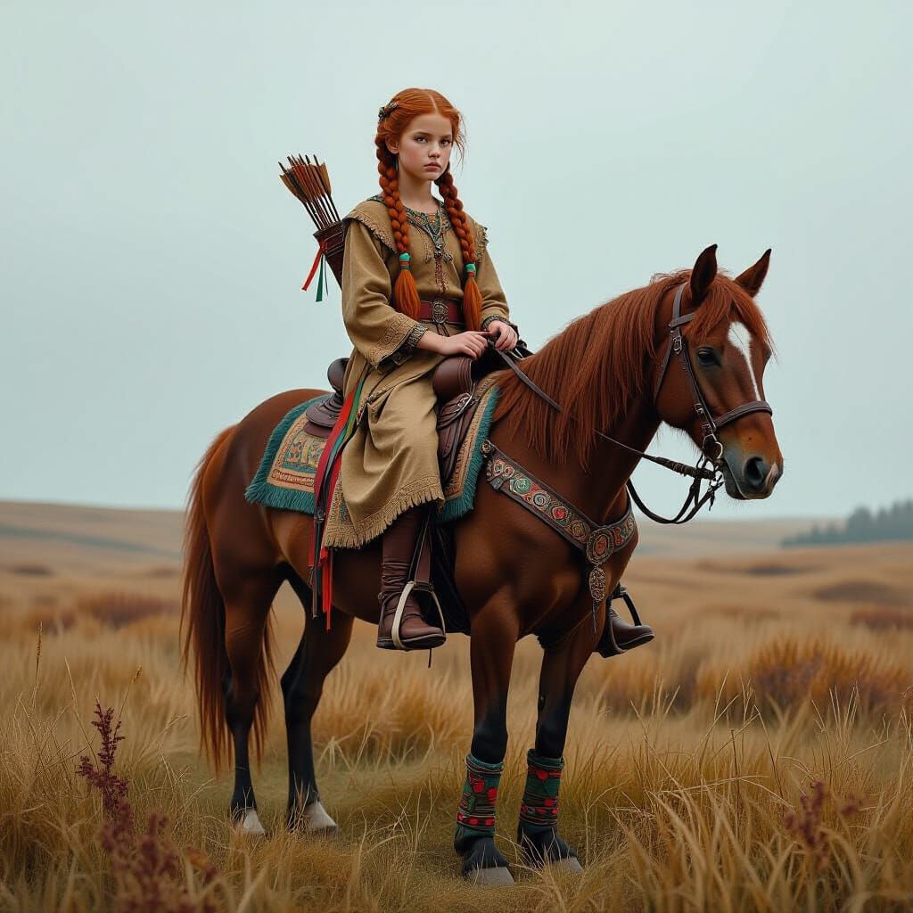 A detailed matte painting of a young nomad princess with braided hair and spiral tattoos, seated on a bay horse in a desolate autumn steppe. Features fantastical concept art with deep, complementary colors.