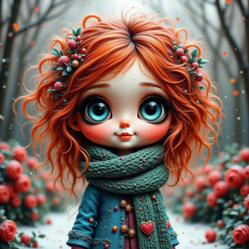 thank you @TheNanabanana for the prompt pretty girl with porcelain skin and large blue eyes, red hair, wearing a blue full coat with embroidered details, a chunky green knit scarf adorned with hearts. She stands in a snowy garden. Snowflakes fall gently around her, and red roses and frosted foliage surround her in a dreamy winter atmosphere.