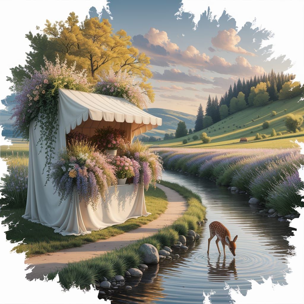 This image showcases a charming flower stall with wildflowers and ivy beside a river. A fawn drinks nearby, set against a sunny countryside backdrop with a soft watercolor and ink style.