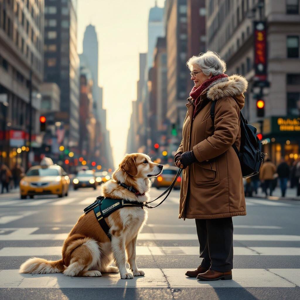 This image depicts a guide dog attentively waiting at a crosswalk on a busy city street, prepared to assist an elderly woman in safely crossing.