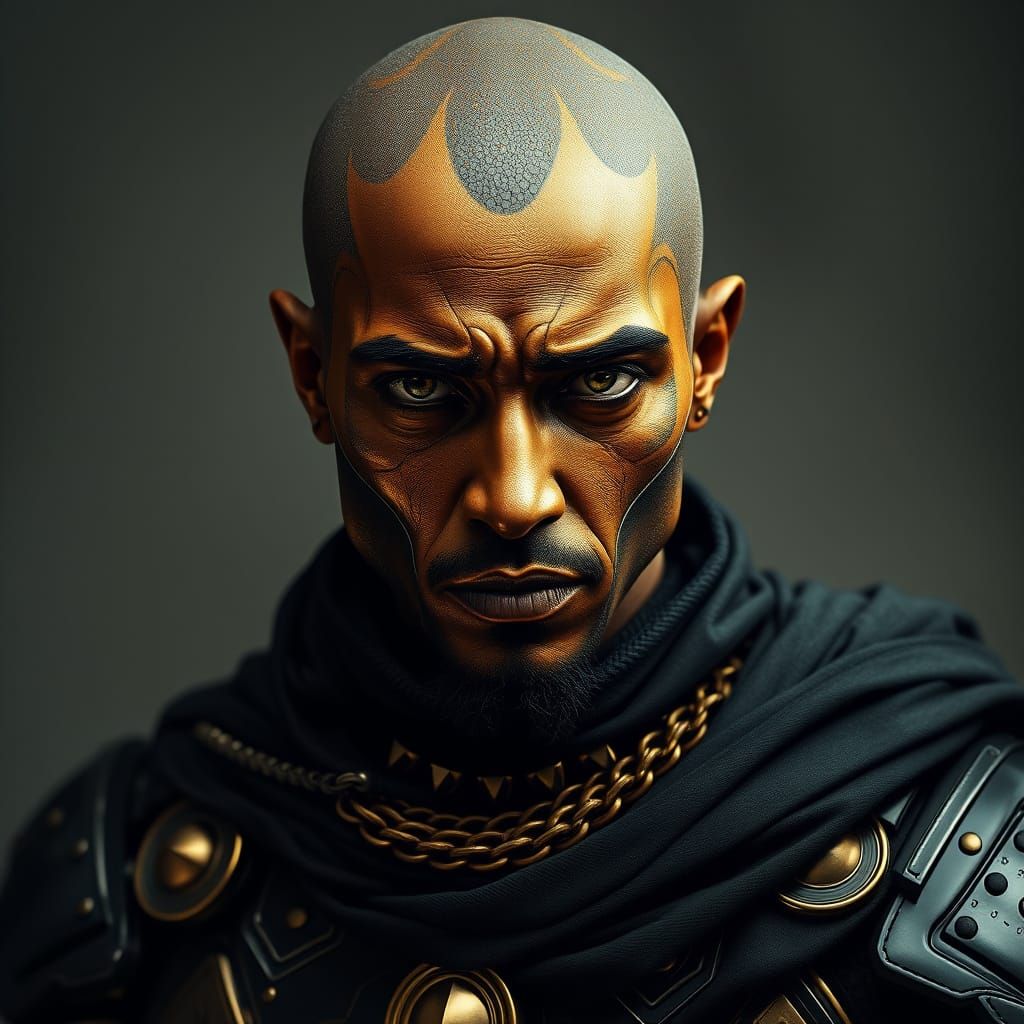 A highly realistic, 8K full HD image of 2Pac's face, depicted without hair and wearing a striking gold and black armor outfit.
