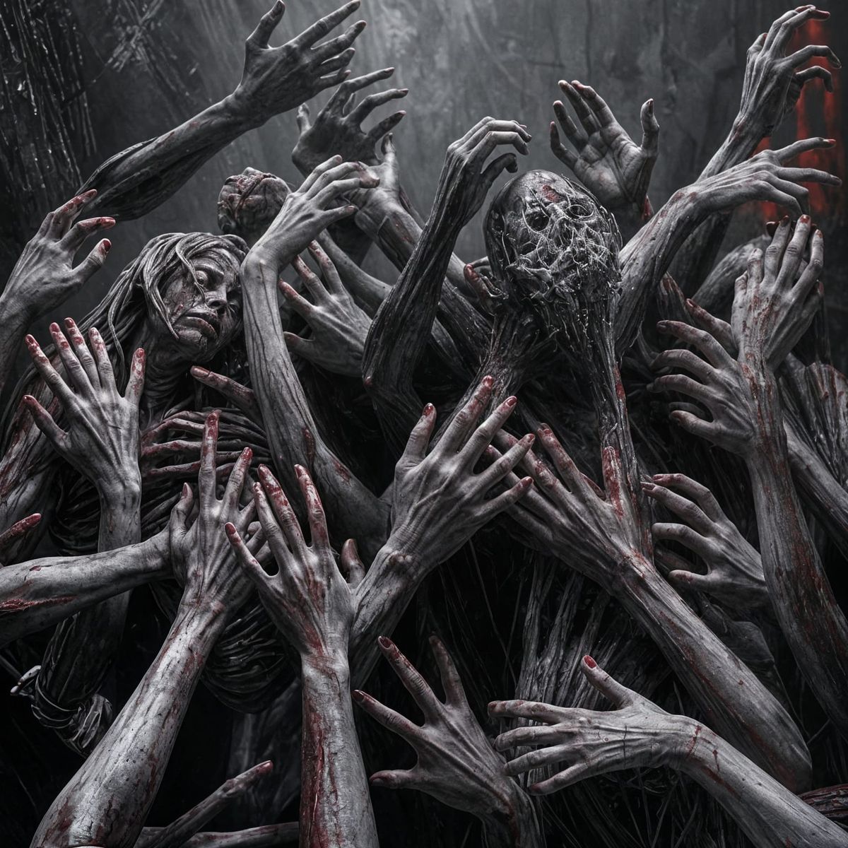 A haunting black and white image of a disturbing accumulation of human arms, set against a dark and foreboding backdrop, with a hint of dark red and striking light.