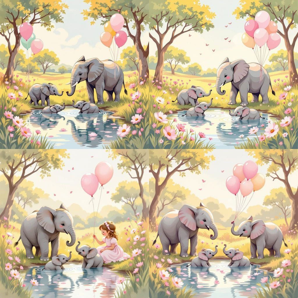 A heartwarming image of elephants celebrating World Elephant Day in a dreamy savanna. Baby elephants play in a pond surrounded by pink flowers and balloons, depicted in a painterly style.