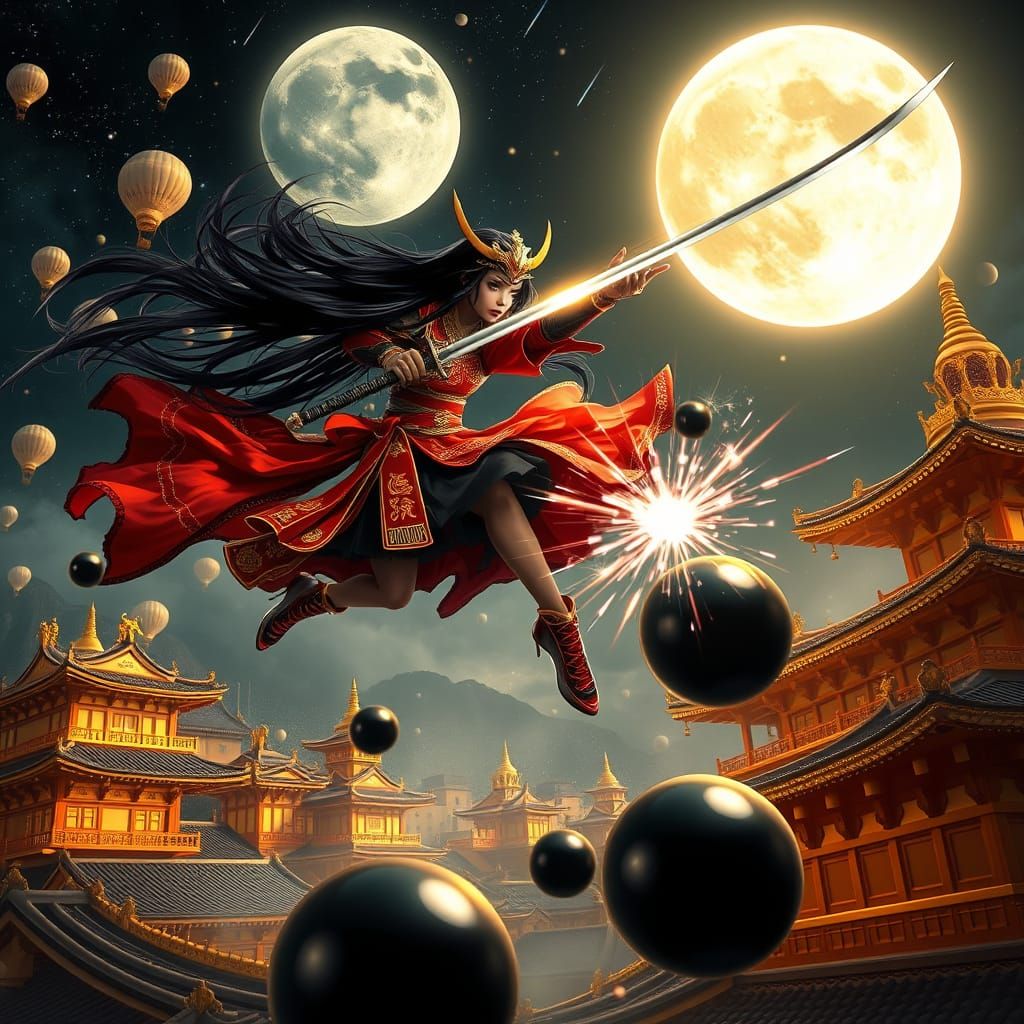 This image depicts a dynamic female samurai in red and gold armor, leaping from rooftops and striking black orbs that burst with light. Rendered with hyperrealism and cinematic lighting.