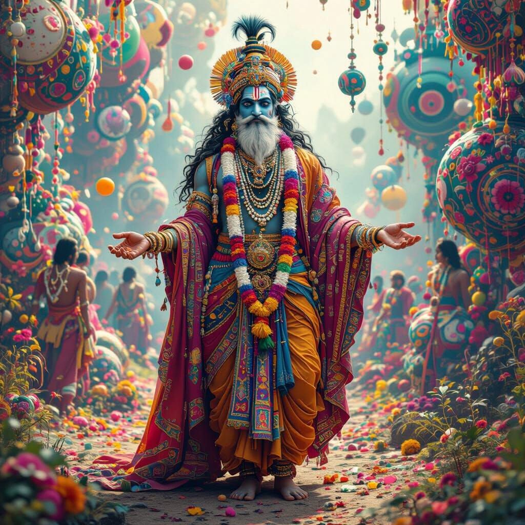 This image shows Dhanvantari at a psychedelic festival. The vibrant colors and swirling shapes are reminiscent of surreal digital art.