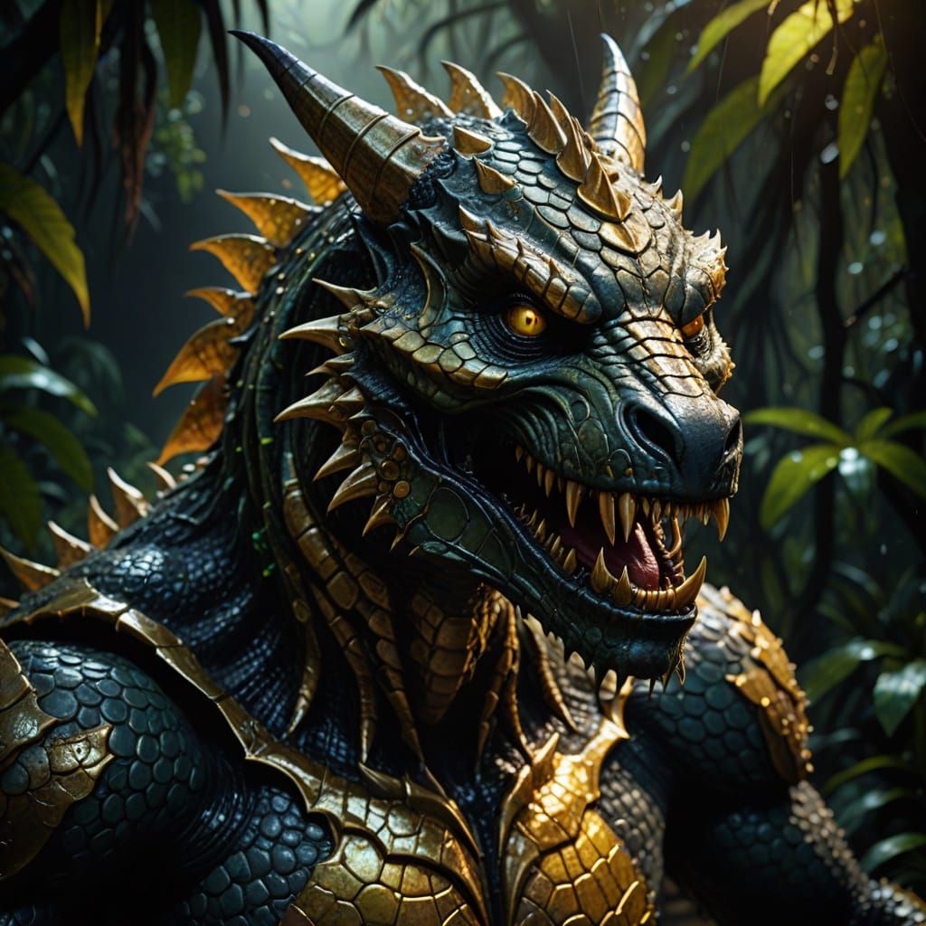 A striking picture of a cryptid creature with glowing acid drool in a dark jungle. The humanoid monster with armored scales is rendered in a realistic 3D style with cinematic lighting and intense shadows.