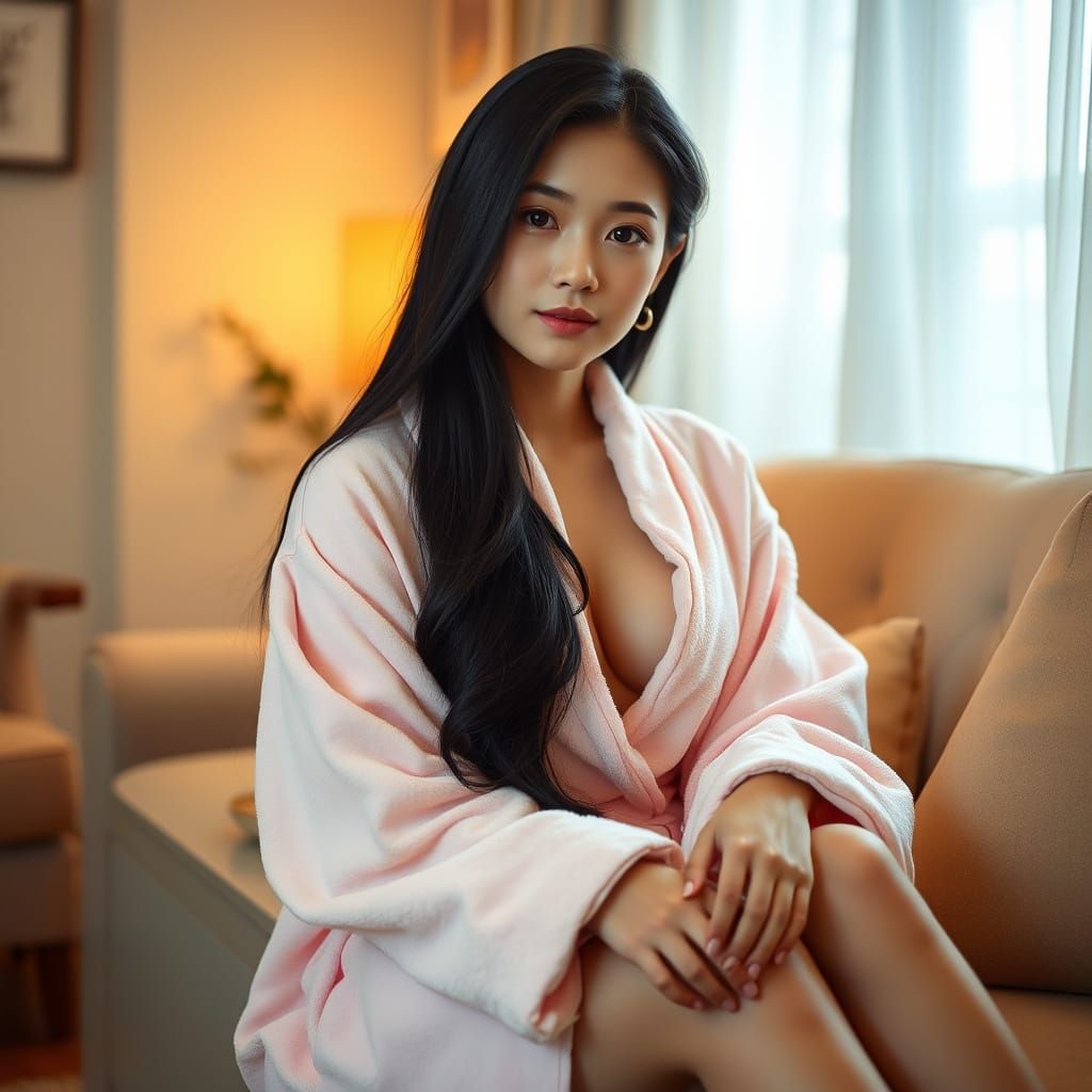 This image showcases a serene young woman in a cozy living room, wrapped in a pale pink bath robe, exuding quiet confidence and poise. Soft lighting and delicate features create a comforting atmosphere.