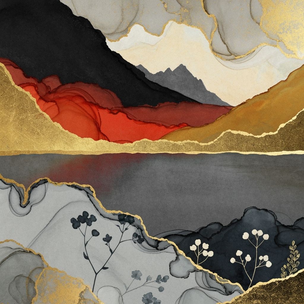 This image shows an abstract landscape of mountains and a lake during sunset. The color palette includes black, red, brown, cream, and gold, rendered with a metallic and stained glass effect.