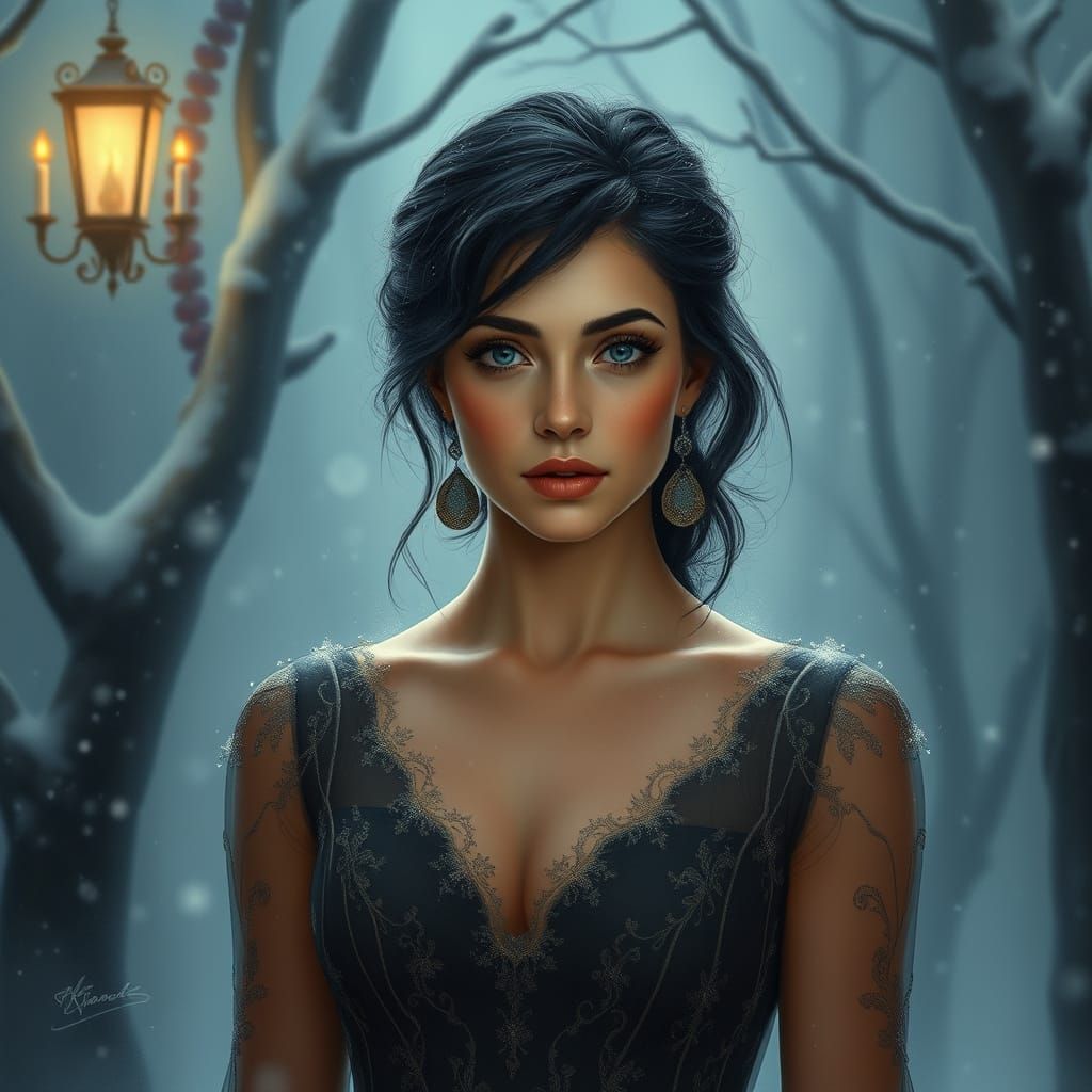 A striking portrait of a tall, slender young woman with dark curly hair. She wears an elegant suit amidst a soft, warm glow and ethereal mist, evoking magical realism and a sense of mystery.