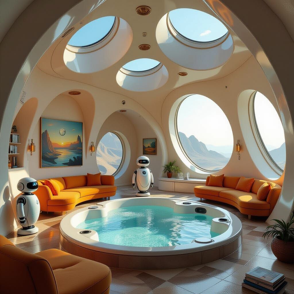 luxurious beautiful comfortable futuristic living room with electronic devices, robots, artwork, skylights, and a hot tub pit. Setting is cozy and hundreds of years from now in peaceful ideal utopian future.
