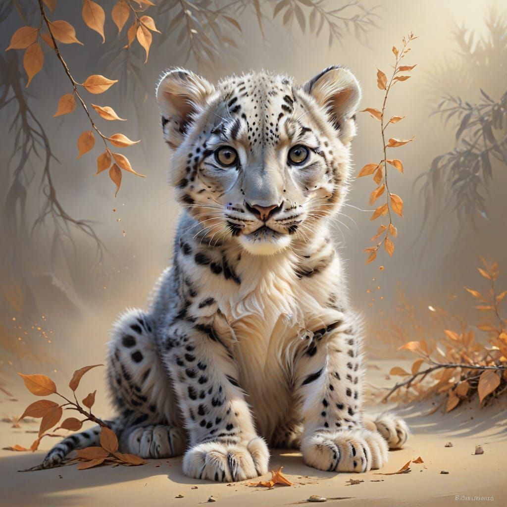 A highly detailed, stylized digital painting of an otherwordly cute, 1 month old snow leopard cub sitting on the sand, its fur depicted in soft monochrome tones with subtle peach and ivory highlights. The scene is bathed in a gentle, ethereal glow, as misty light filters through elegant, winding branches ...