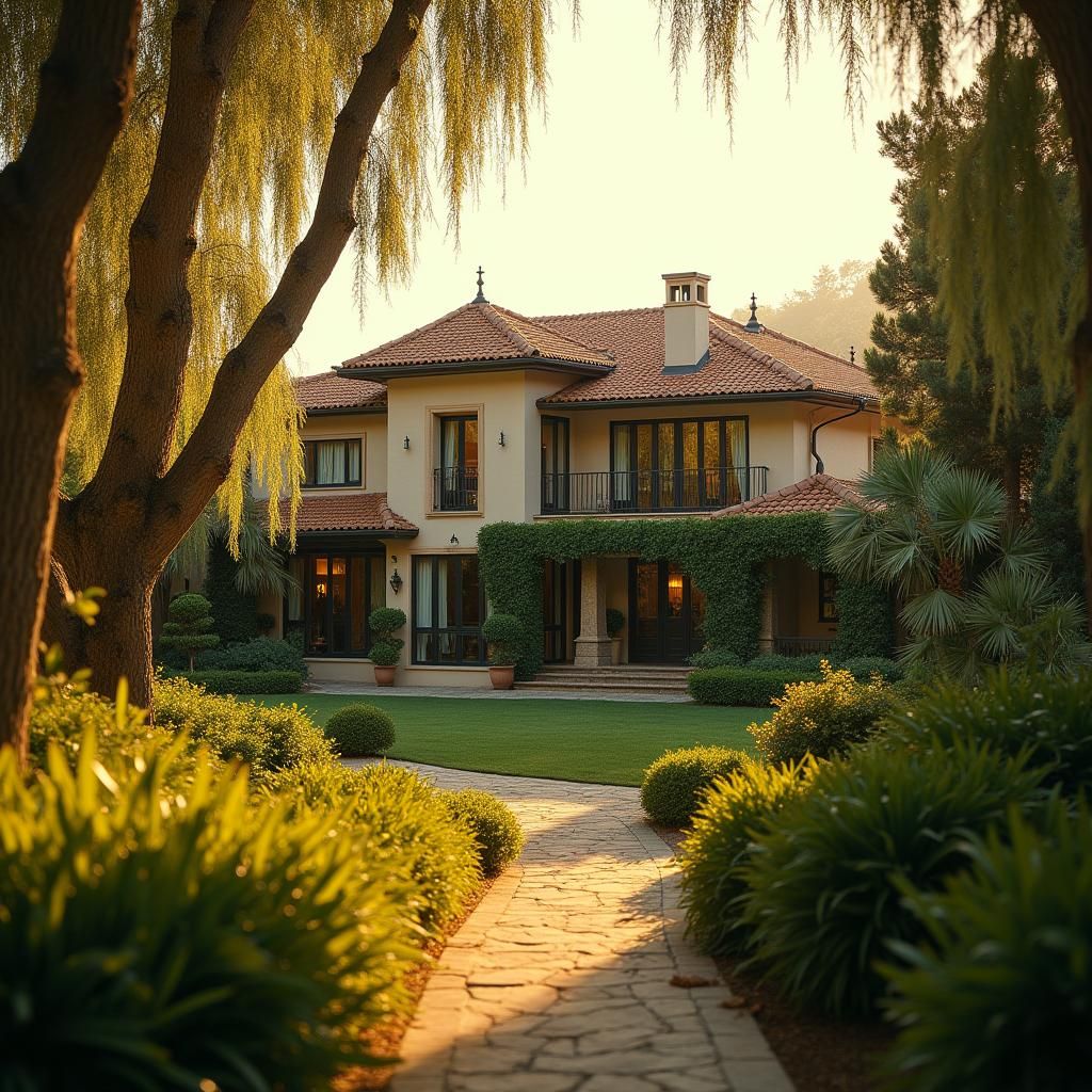 A striking picture of a majestic house nestled in a peaceful, green environment, bathed in warm light. The scene exhibits a cinematic aesthetic with rich color tones, subtle film grain, and a vignette effect.