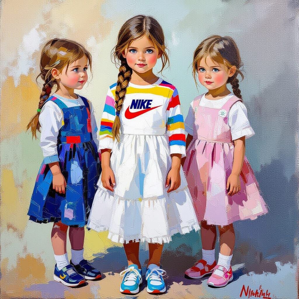 A vibrant neo-impressionistic painting of three young girls. The girls are dressed in matching outfits, with colorful striped shirts, white skirts and blue eyes, rendered with thick layers of textured paint.