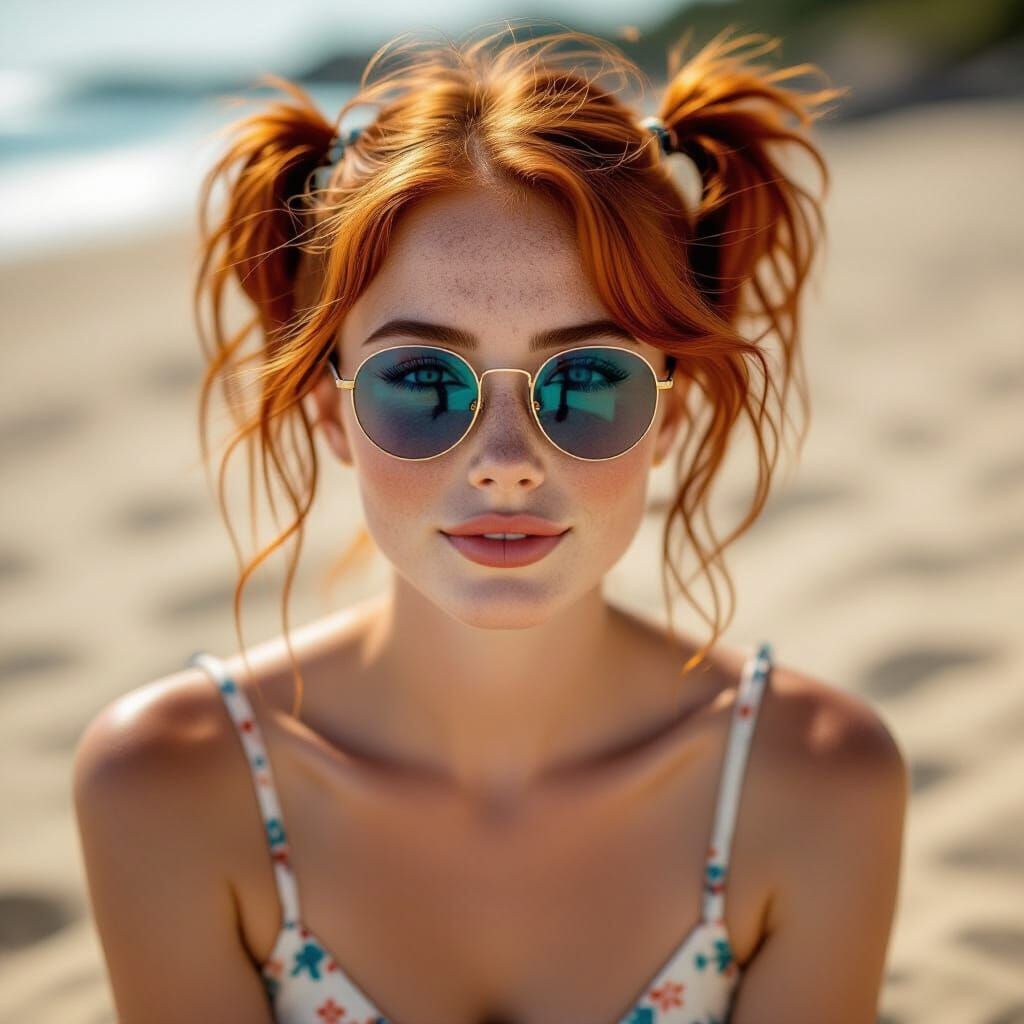 A young woman with red pigtails, blue eyes, and freckles relaxes on a beach. Photographed with warm natural light and a shallow depth of field for a professional look.